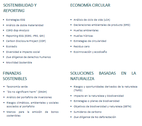 A través de un enfoque integral, apoyamos a las organizaciones en la definición de estrategias ESG, el reporting de sostenibilidad, la optimización de recursos mediante economía circular, la integración de la biodiversidad en la gestión empresarial y el desarrollo de soluciones basadas en la naturaleza. Nuestro objetivo es ayudar a las empresas a gestionar riesgos, identificar oportunidades y generar valor sostenible a largo plazo.