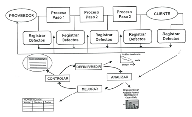 Los proyectos seis sigma, se desarrollan siguiendo una metodología muy precisa, conocida como DMAIC (Definir – Medir – Analizar – Mejorar (Improve) – Controlar). Esta metodología es una variante del conocido como ciclo universal de mejora PDCA (Plan – Do – Check – Act), pero que ha sido desarrollada en detalle y adaptada a la forma de trabajo de los equipos Seis Sigma. La principal diferencia es la metodología DMAIC hace mucho énfasis en el proceso de medición, análisis y mejora, y no está planteada como un proceso de mejora continua. Como se ha comentado anteriormente los proyectos seis sigma, deben tener una duración limitada en el tiempo, y por tanto no se basan tanto en la mejora continua, como en abordar problemas complejos, con alto impacto en los resultados empresariales.